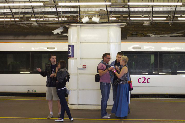 Что такое 9 мая в Лондоне? Да ничего, обычный рабочий день. Поэтому замороченные лондонцы абсолютно не реагируют на наши поползновения. Итак, утро. Все просыпаются в разных версиях абстинентного синдрома. Потом гигиенические процедуры, завтрак, пивас, сборы и 7 человек выдвигаются к вокзалу Кинг Кросс. Ещё бы, отметить 9 мая на исторической родине, в Бэзилдоне, стало нашей навязчивой мечтой с того момента, когда только начались разговоры об этой поездке. На вокзале были приобретены тикеты, очень похожие на те, которые продаются в московском метрополитене. Так как мы ехали толпой, цена билета туда и обратно составила 6 фунтов стерлингов. Но для того чтобы выйти на нужную платформу нам пришлось вновь прокатиться на метро. Наконец мы пришли на платформу и начали потихоньку добавлять новые кадры в фотосессию. Электричка пришла без опоздания. Сначала мы загрузились в вагон на стенках которого было написано Silent. В первый раз всегда бывает много непонятного и поэтому кондуктор турнул нас из этого вагона минут через 15, так как мы были далеко не silent, а veryveryloudnessanddrunken!!! Ехать до Бэза надо было минут сорок пять, поэтому мы и пофоткались и выпили и песни попели. И вот наконец на горизонте появился тот самый буранный полустанок. Двери открылись, и мы вышли на платформу, как космонавты на Луну. Наверное, поднятие на Эверест все-таки гораздо труднее, но лично у меня присутствовало ощущение, что чего-то из ряда вон выходящее мы сделали. Те пять-шесть местных аборигенов, которые находились на двух платформах, стали свидетелями нашей радости, эмоций и угара. Около получаса мы безжалостно эксплуатировали вывеску с надписью BASILDON и зеркала для машинистов. Надо сказать, что погода выдалась на редкость удачная. Яркое солнышко, слабый ветерок, +63 градуса по Фаренгейту. Классика 9 мая.