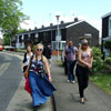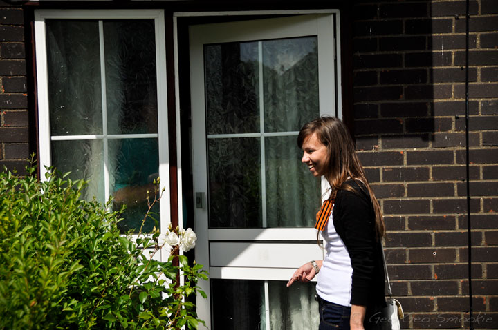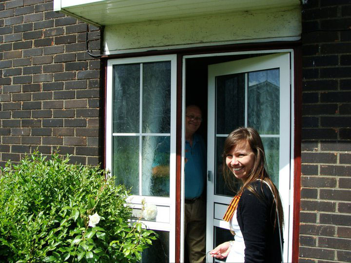 Постепенно появляются признаки усталости. Наша группа растягивается метров на пятьдесят. Идущие первыми сигнализируют следующим о поворотах, те сигнализируют остальным. Солнышко припекает, алкоголь действует, но мы немного одержимы этим путешествием и не смотря ни на что, движемся по маршруту. И потихоньку с нами начинают происходить небольшие чудеса. Мы доходим до улицы Woolmer Green, на которой стоит дом Флетча под номером 101, подходим к нему и, когда передние уже фотографируют панораму, внезапно открывается соседняя дверь и миловидная тётя после небольшого разговора предлагает всем войти. Я как бы остался ждать Диму, который шел замыкающим и делился впечатлениями по мобильнику с кем-то в России. Когда он подошел я не нашел каких-либо правдоподобных объяснений, зачем соседка Флетча пустила к себе в дом компанию из пяти подвыпивших человек. Версия про туалет была, на мой взгляд, самая правдоподобная. А тут ещё псина, которая выскочила из-за двери перед тем, как та закрылась. Достаточно немолодой ласковый барбос, который смотрел на нас, оставшихся непонятным взглядом, мол чего вы здесь не видели-то? Пришлось угощать псину всякими вкусностями, которые завалялись у меня в рюкзаке. Народ всё не выходил. Наконец и нам стало любопытно, чего же такое там происходит? Пришлось совершить проникновение в частную собственность. Входили как детективы в голливудских фильмах, по стеночке – рывками просматривая комнаты. Голоса слышались со второго этажа и увидел умиротворяющую картину: тётя все говорила и говорила, а ребята иногда задавали вопросы и посмеивались в ответ. Как только я понял, что здесь всё ОК, мне снова сразу захотелось на свежий воздух. Дима в это время просто спокойно бродил по комнатам первого этажа. Когда хозяюшка это увидела, на мой взгляд, она немного заволновалась. В общем, свалили мы из этой квартирки. Эта милая соседка много рассказала о тех годах, когда радом с ней жила семья Флетчеров.