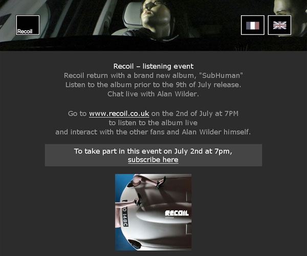 И он сдержал свое слово! Сегодня, 2 Июля, в 22.00 по Московскому времени (19.00 GMT) любой желающий сможет зайти на официальный сайт Алана recoil.co.uk, послушать все композиции из альбома subHuman, релиз которого состоится уже через неделю, 9 Июля, а также пообщаться с другими поклонниками и с самим Аланом в чате. Кроме этого, планируется, что Алан будет доступен всем посетителям сайта и визуально, через веб-трансляцию.