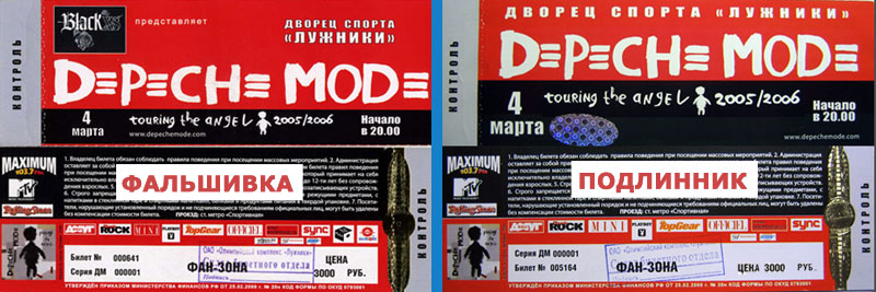 Как сообщает сайт DMFan.ru, в Москве появились в продаже фальшивые билеты в ФАН-ЗОНУ ДС Лужники на Московский концерт Depeche Mode, который состоится 4 Марта 2006 года. Первым потерпевшим, о котором стало известно, стал посетитель вышеназванного сайта, который приобрел такой билет за 7000 рублей в билетном интернет-магазине www.ebilet.ru.
